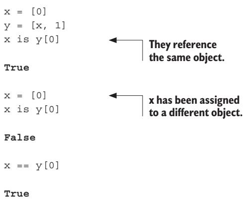 Because the objects they refer to can’t change, the behavior of the variables in this case is consistent with either explanation. In fact, in this case, after the third line, a, b, and c all refer to the same unchangeable integer object with the value 1. The next line, b = 5, makes b refer to the integer object 5 but doesn’t change the references of a or c.