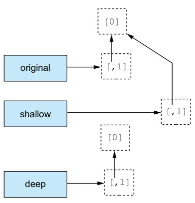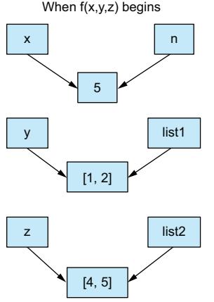 If you’re thinking of variables as containers, this result makes no sense. How could changing the contents of one container simultaneously change the other two? However, if variables are just labels referring to objects, it makes sense that changing the object that all three labels refer to would be reflected everywhere.